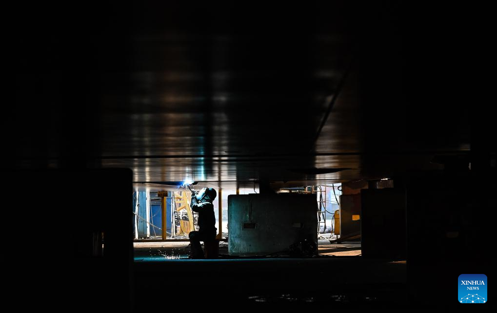 A worker works in Jiangsu Yangzi Xinfu Shipbuilding Co., Ltd. in Taixing, east China's Jiangsu Province, Dec. 5, 2023.