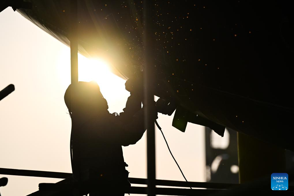 A worker works at a shipyard of Jiangsu Yangzi Xinfu Shipbuilding Co., Ltd. in Taixing, east China's Jiangsu Province, Dec. 5, 2023.