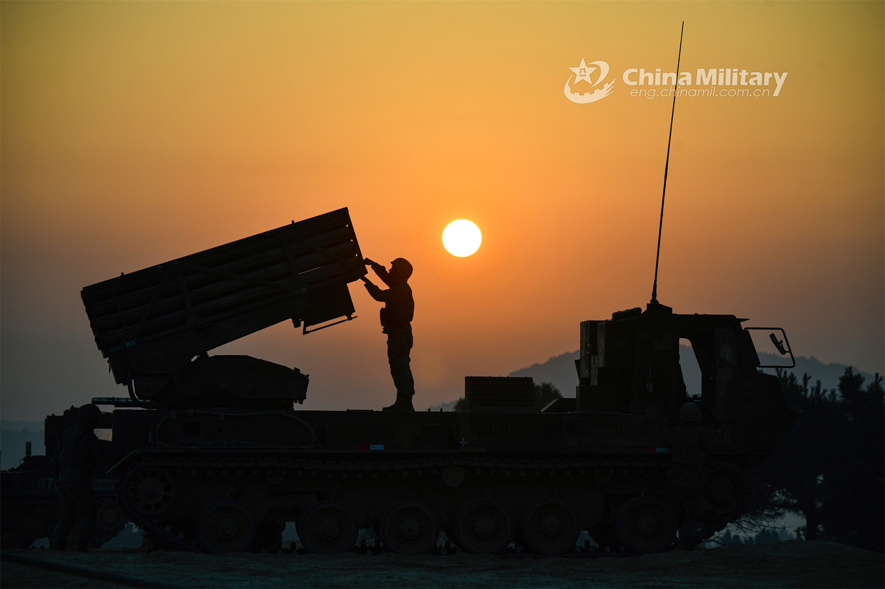 A soldier assigned to a brigade under the PLA 73rd Group Army inspects a vehicle-mounted multiple launch rocket system during a live-fire training exercise on October 30, 2023. The brigade organized the live-fire confrontation training from October 22 to November 6 to improve the troops' combat capability. (eng.chinamil.com.cn/Photo by Chi Juncheng)