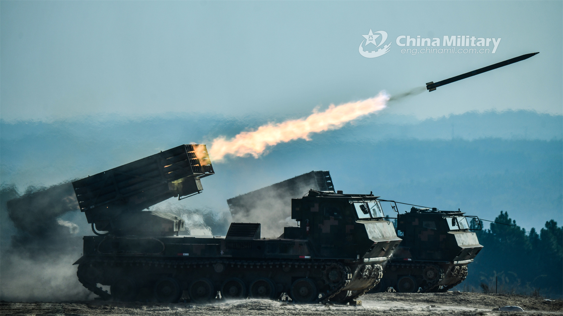 Vehicle-mounted multiple launch rocket systems attached to a brigade under the PLA 73rd Group Army fire at mock target during a live-fire training exercise on October 30, 2023. The brigade organized the live-fire confrontation training from October 22 to November 6 to improve the troops' combat capability. (eng.chinamil.com.cn/Photo by Chi Juncheng)