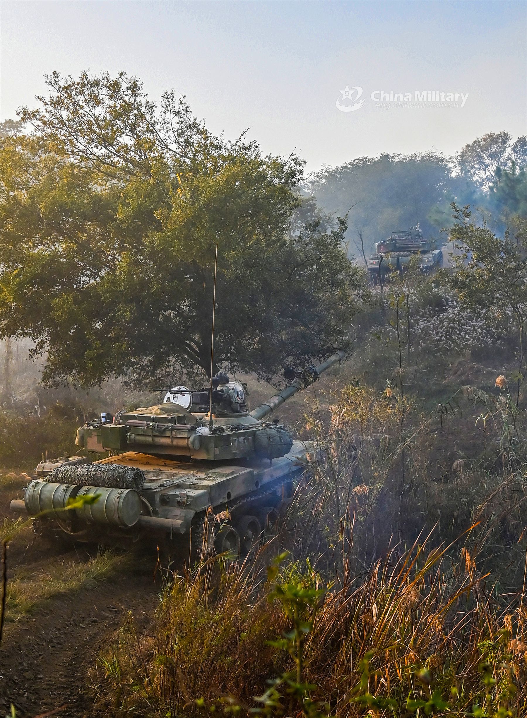 Tanks attached to a brigade under the PLA 73rd Group Army march in the jungle during a live-fire training exercise on October 26, 2023. The brigade organized the live-fire confrontation training from October 22 to November 6 to improve the troops' combat capability. (eng.chinamil.com.cn/Photo by Chi Juncheng)