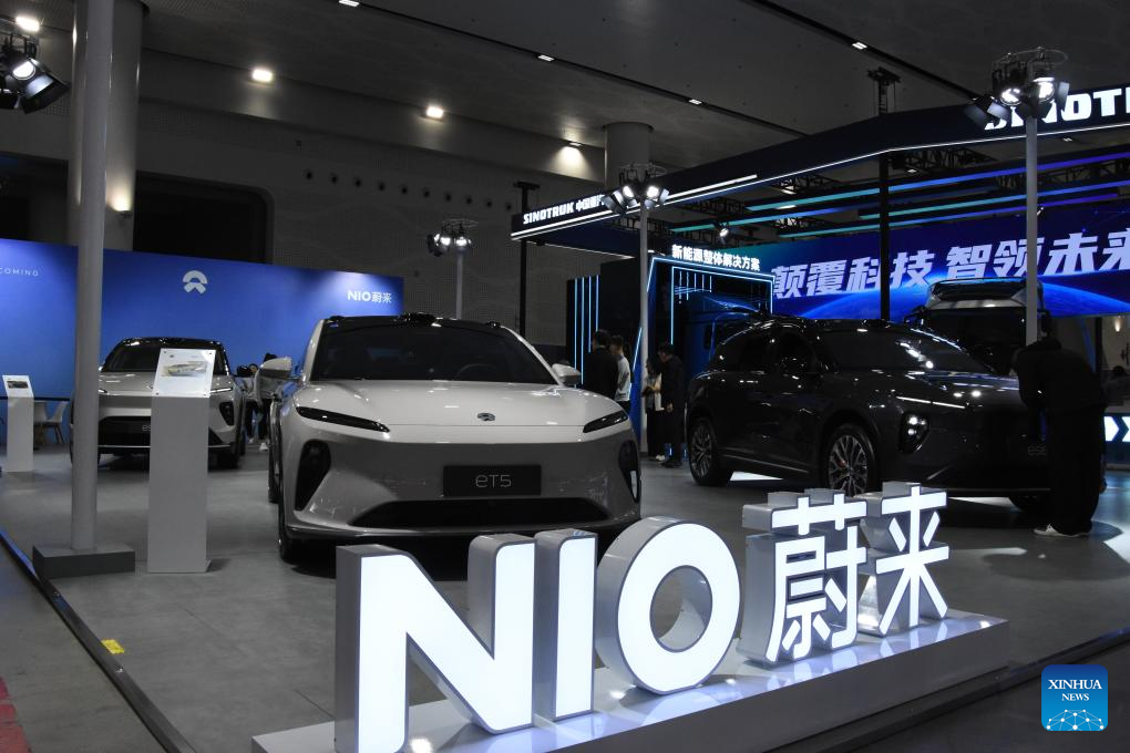 This photo shows vehicles of Chinese electric car manufacturer NIO displayed at the 2023 World New Energy Vehicle Congress in Haikou, south China's Hainan Province, Dec. 7, 2023. (Xinhua/Xia Tian)