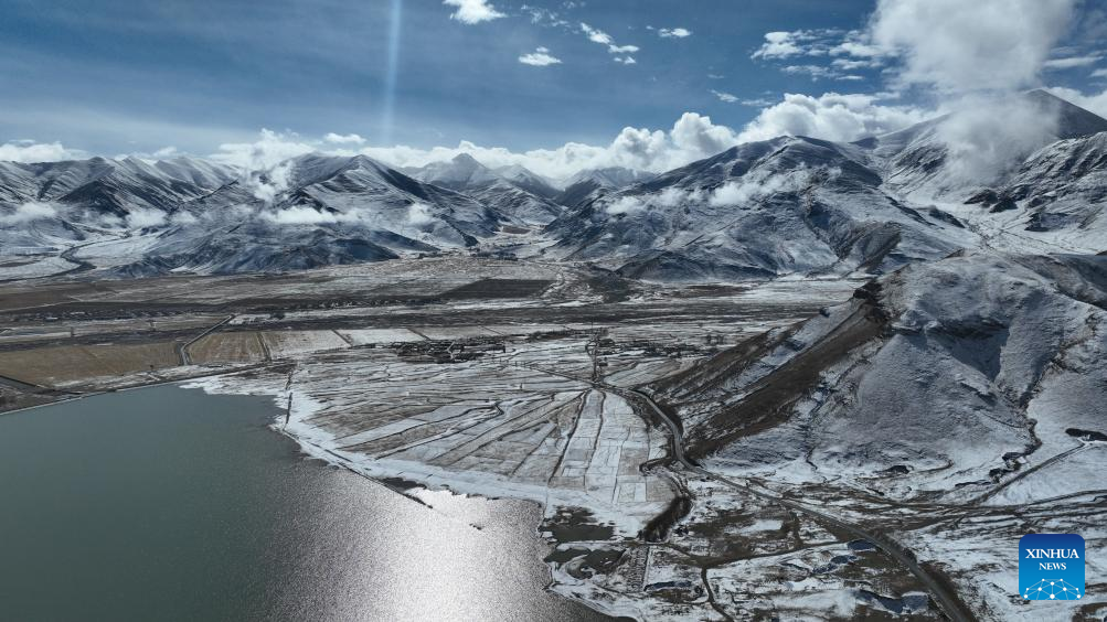 This aerial photo taken on Dec. 8, 2023 shows snow scenery in Lhunzhub County of Lhasa, southwest China's Xizang Autonomous Region. (Xinhua/Jigme Dorje)