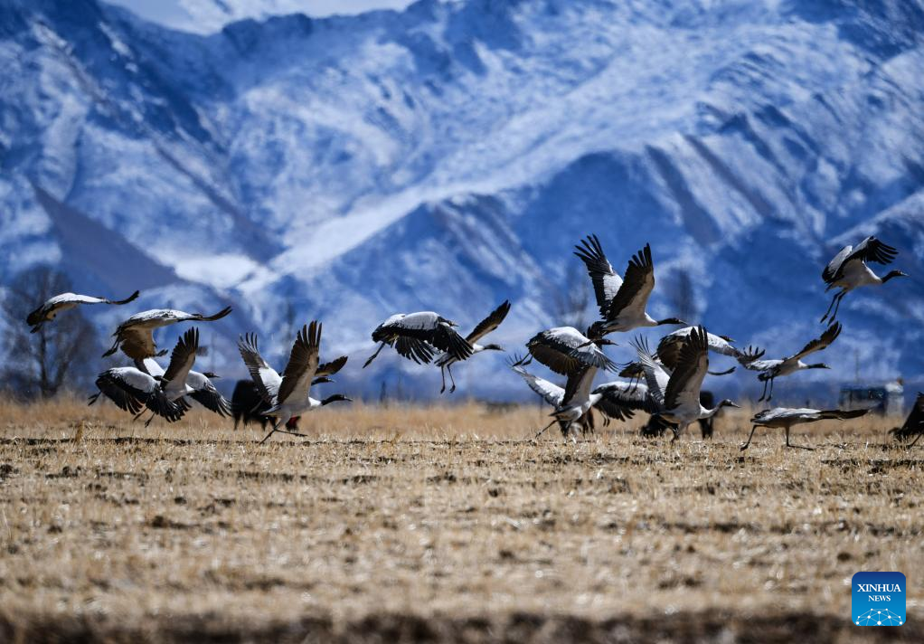 - Black-necked cranes seen at reservoir in county of Lhasa, China's Xizang