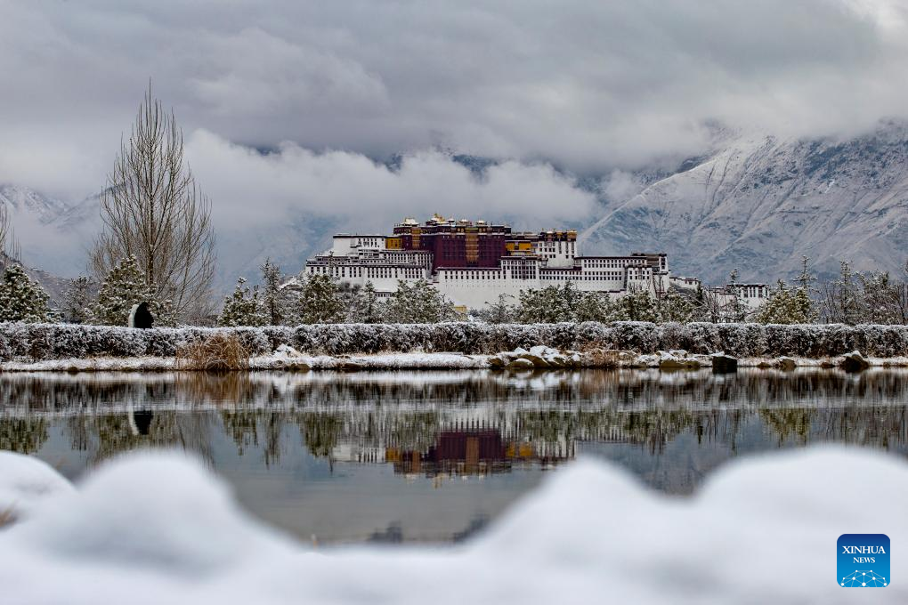 This photo taken on Dec. 8, 2023 shows the Potala Palace after snow in Lhasa, southwest China's Xizang Autonomous Region. (Xinhua/Jiang Fan)