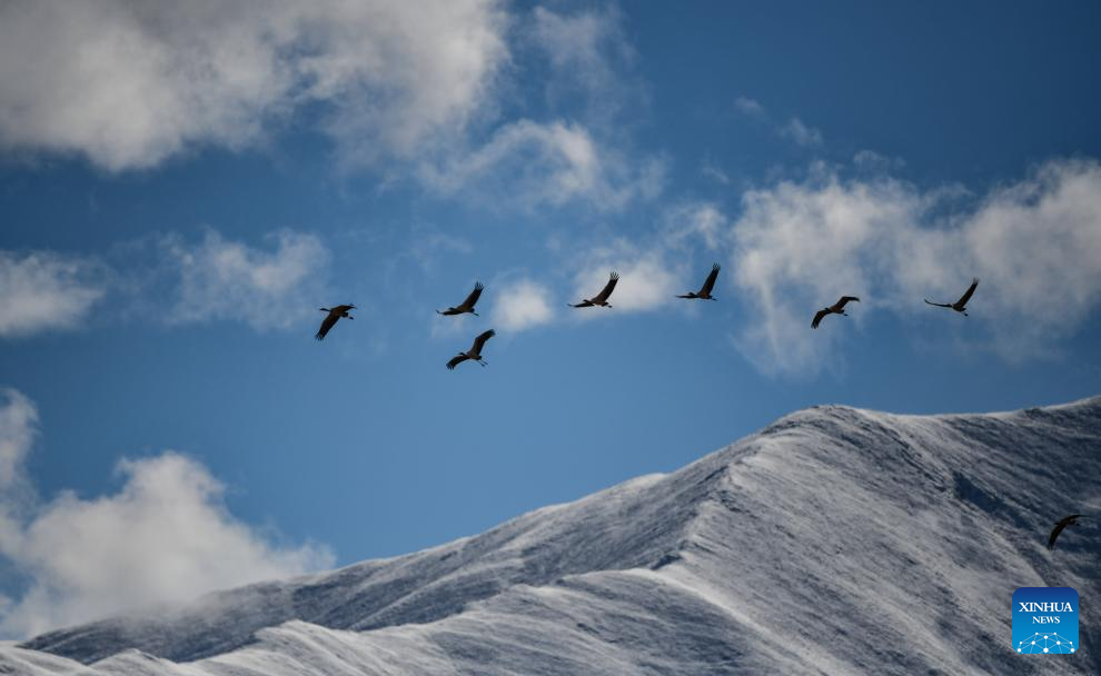 This photo taken on Dec. 8, 2023 shows black-necked cranes flying past snow-covered mountains in Lhasa, southwest China's Xizang Autonomous Region. (Xinhua/Jigme Dorje)