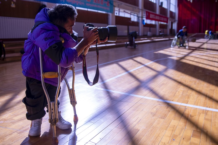 Lhapa Dondrup takes photos during a wheelchair basketball training session in Lhasa, southwest China's Xizang Autonomous Region, Nov. 26, 2023. (Xinhua/Jiang Fan)