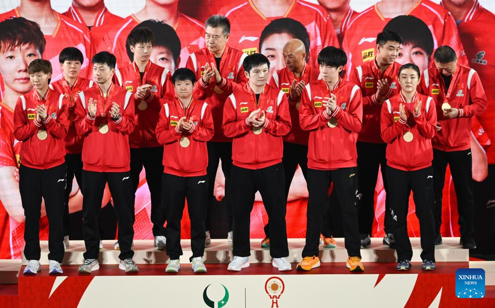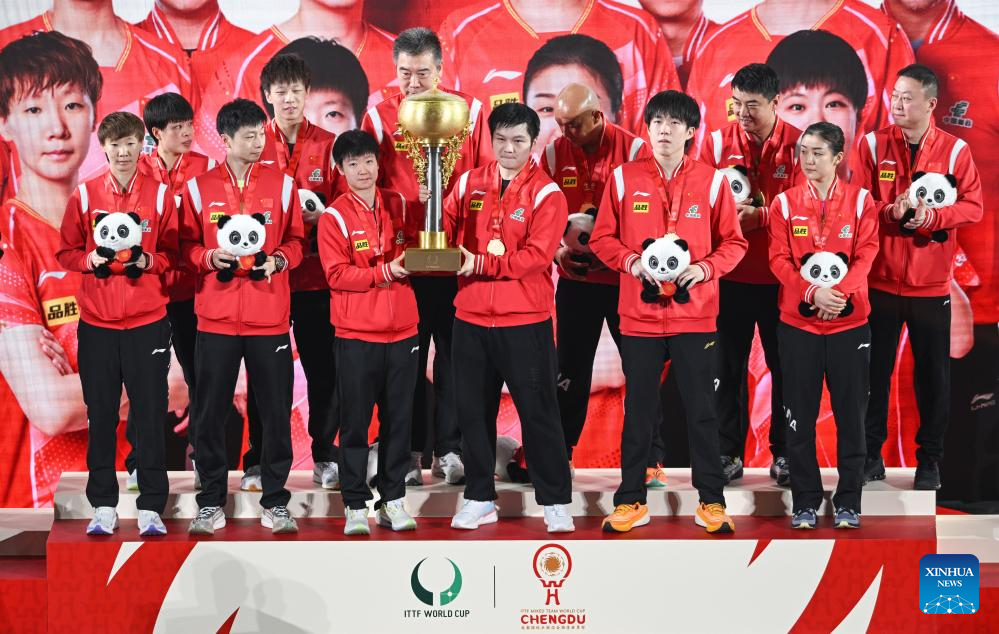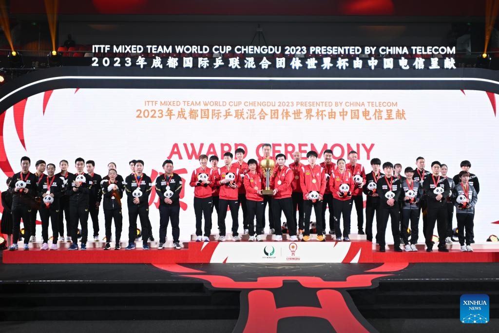 First placed team China celebrate during the awarding ceremony of the ITTF Mixed Team World Cup 2023 in Chengdu, southwest China's Sichuan Province, Dec. 10, 2023. (Xinhua/Wang Xi)