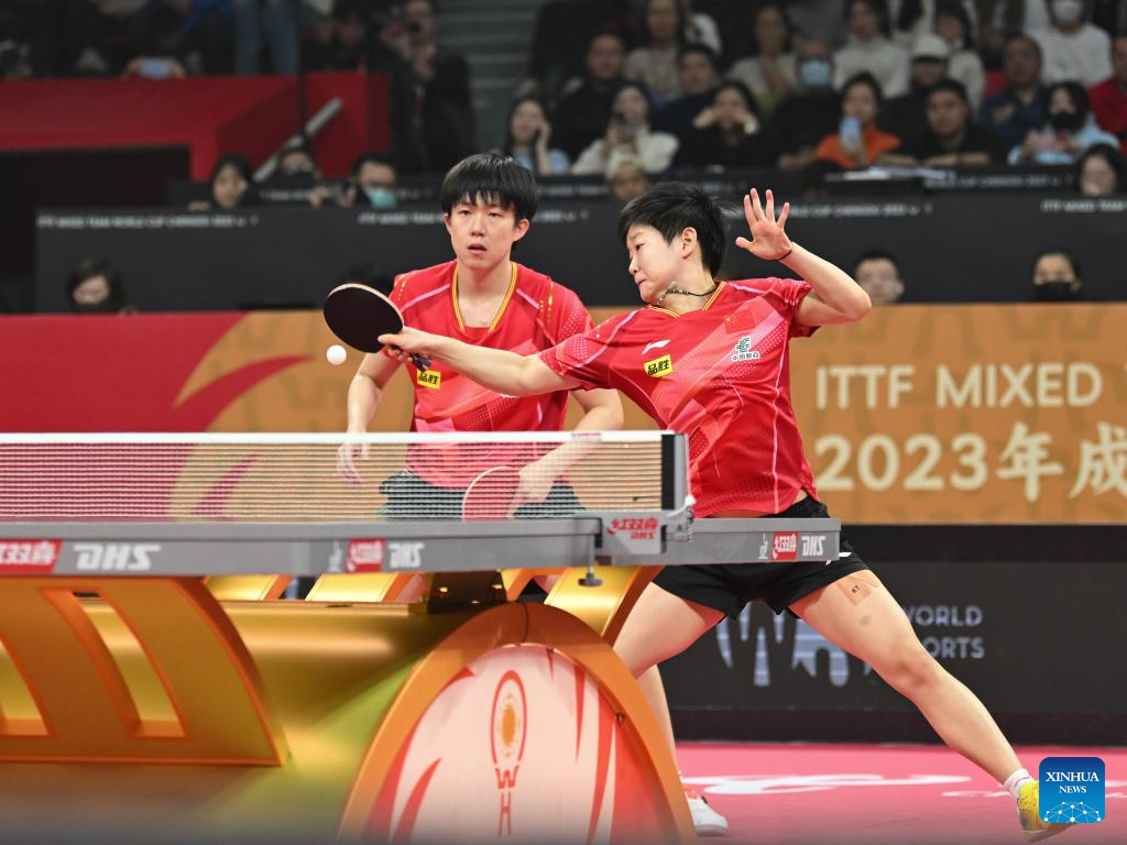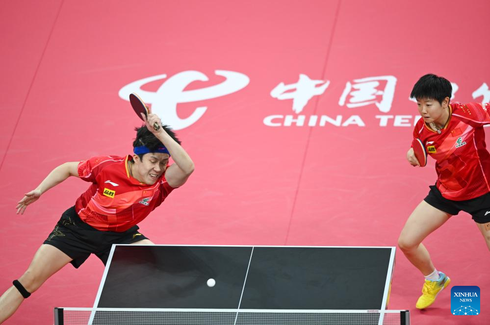 Wang Chuqin (L)/Sun Yingsha of China compete during the stage 2 mixed doubles match against Shin Yubin/An Jaehyun of South Korea at the ITTF Mixed Team World Cup 2023 in Chengdu, southwest China's Sichuan Province, Dec. 10, 2023. (Xinhua/Wang Xi)