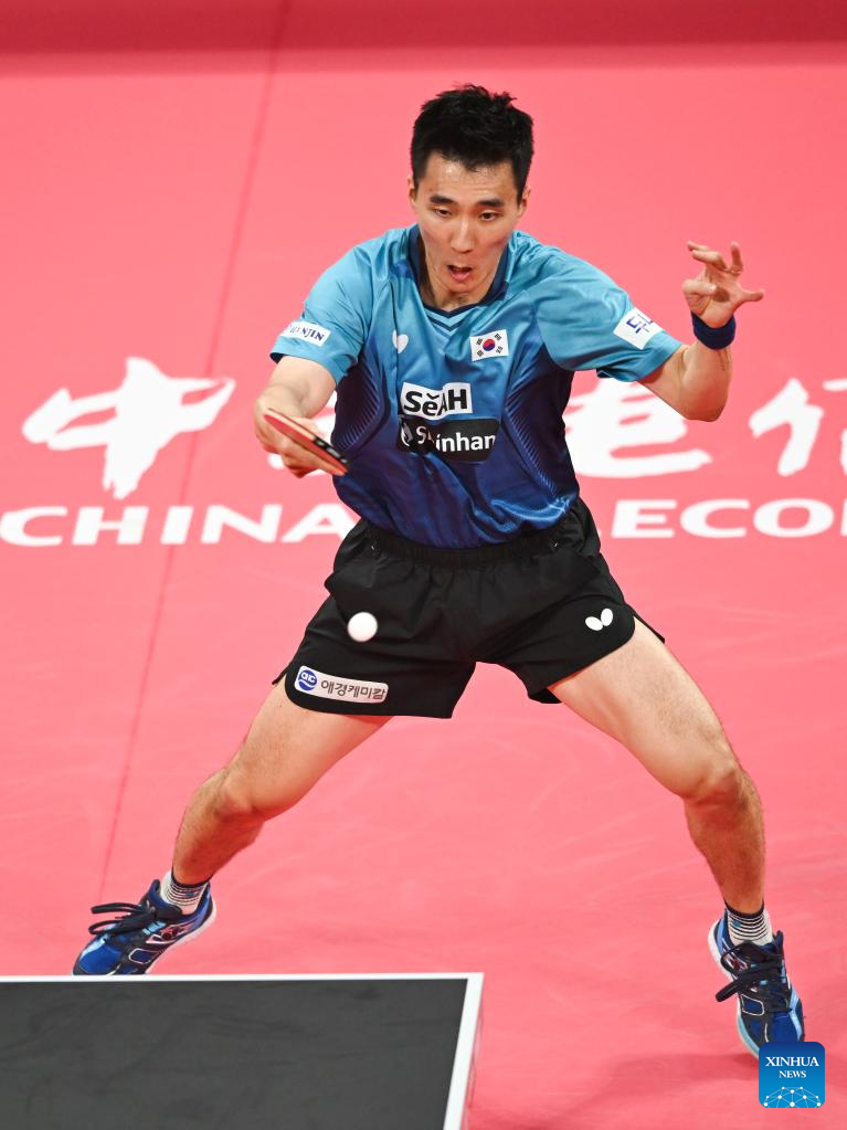 Lee Sangsu of South Korea competes during the stage 2 men's singles match against Fan Zhendong of China at the ITTF Mixed Team World Cup 2023 in Chengdu, southwest China's Sichuan Province, Dec. 10, 2023. (Xinhua/Wang Xi)