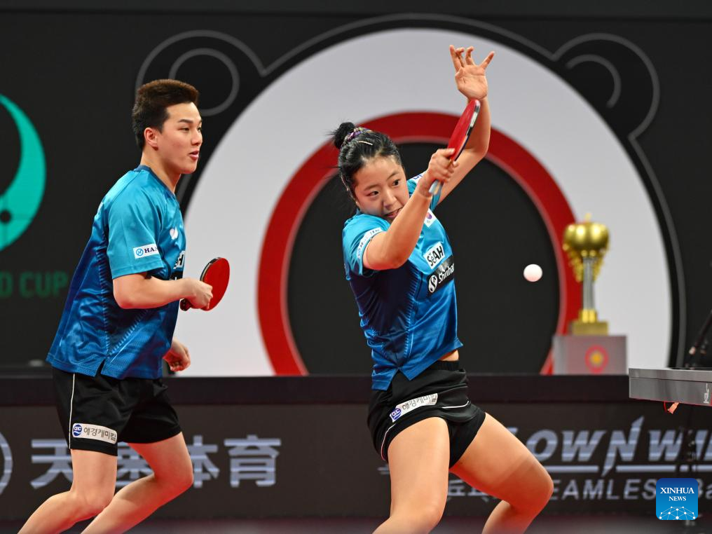 Shin Yubin (R)/An Jaehyun of South Korea compete during the stage 2 mixed doubles match against Wang Chuqin/Sun Yingsha of China at the ITTF Mixed Team World Cup 2023 in Chengdu, southwest China's Sichuan Province, Dec. 10, 2023. (Xinhua/Xu Bingjie)