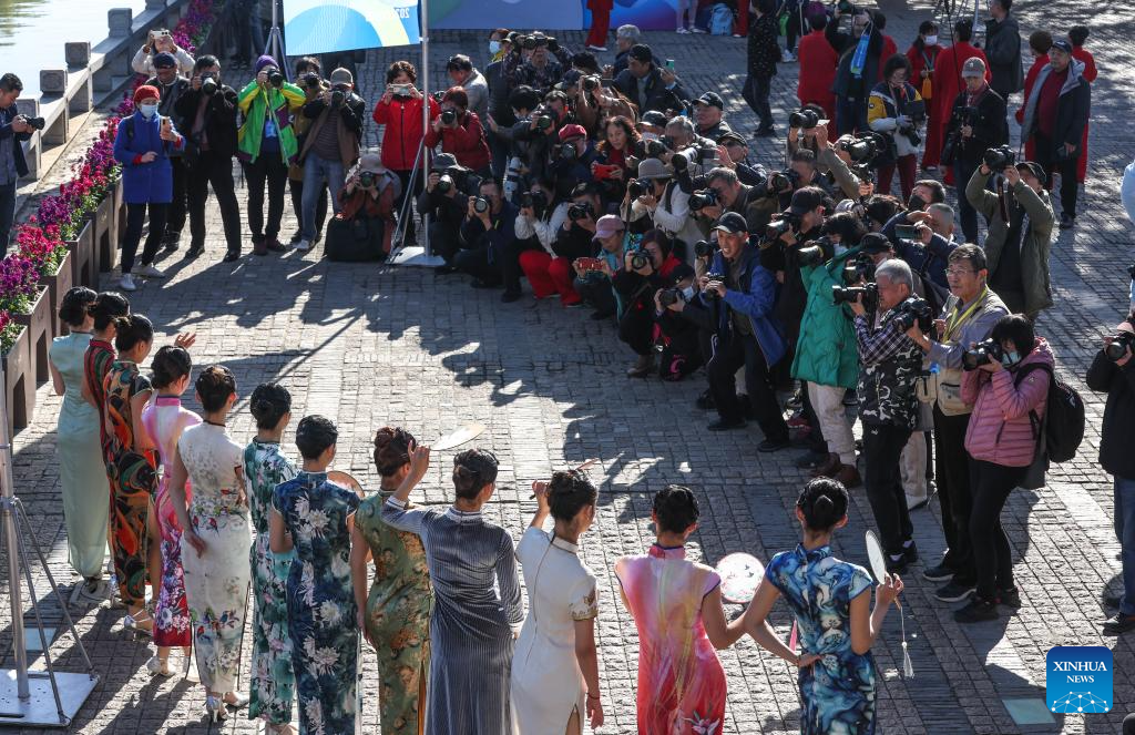 People take photos of a show featuring Qipao, a traditional Chinese dress for women, at a historical and cultural district along the Grand Canal in Wuxi, east China's Jiangsu Province, Dec. 8, 2023. (Xinhua/Yang Lei)