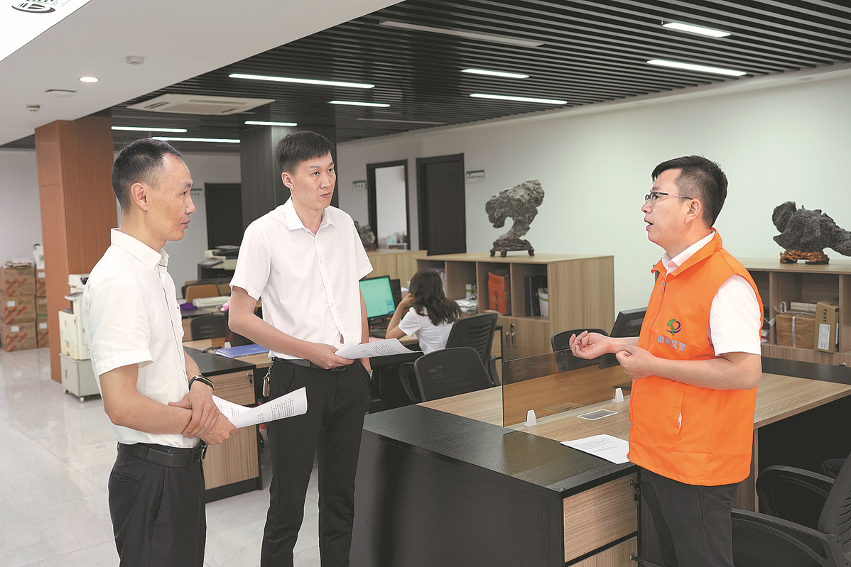 A volunteer police officer (right) visits a trading company in Zhuji to learn about its operational problems. [Photo/Xinhua]