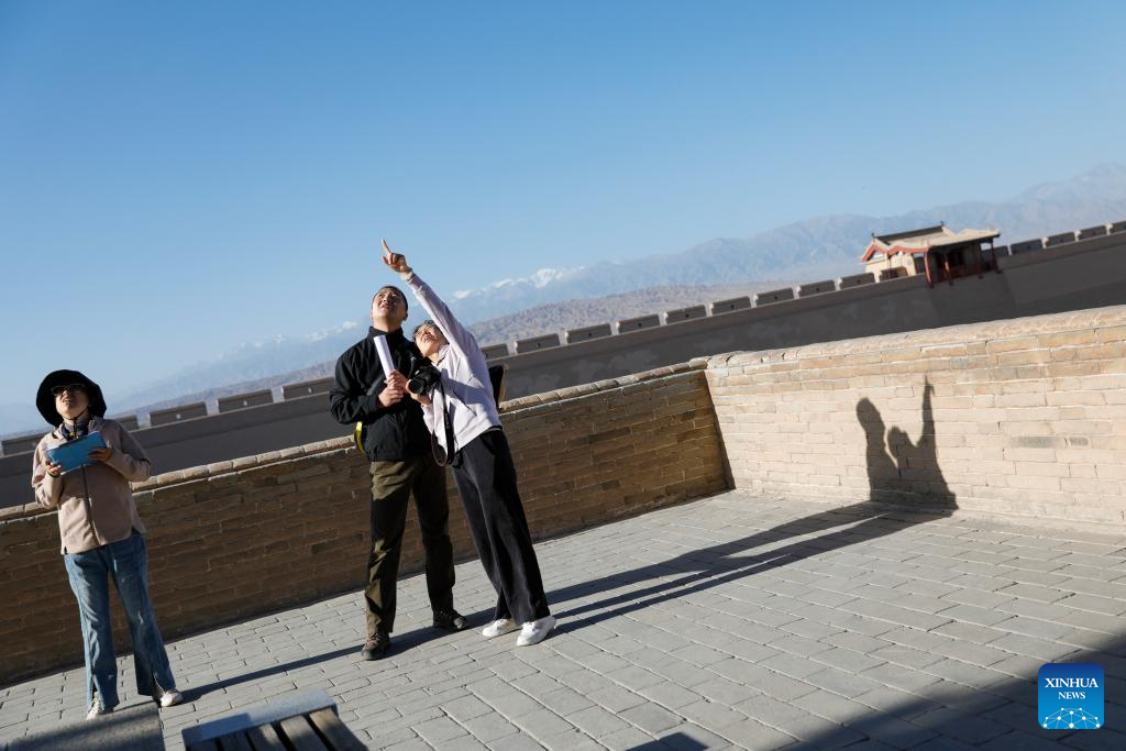 Yang Diangang, an associate researcher from the cultural heritage monitoring center of Jiayuguan Silk Road (the Great Wall) cultural research institute, checks the monitoring system at the Jiayu Pass scenic area in Jiayuguan City, northwest China's Gansu Province, Sept. 26, 2023. In recent years, cultural heritage protection institutions have increased the investment in the technological protection of the Great Wall. Institutions utilize technological equipment to collect data, analyze metrics and detect any possible damage. These methods guarantee the implementation of effective preservation and restoration measures in time and the Great Wall well-preserved. (Xinhua/Fang Xin)