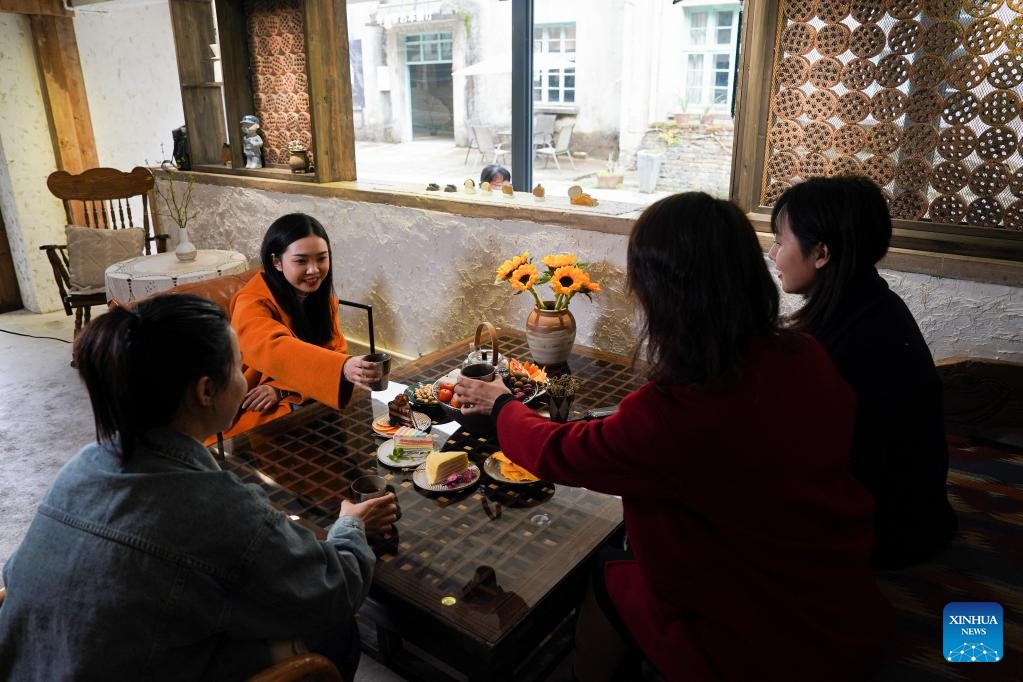 Young customers drink tea at a teahouse in Huangshan city, east China's Anhui Province, March 9, 2023. (Xinhua/Du Yu)