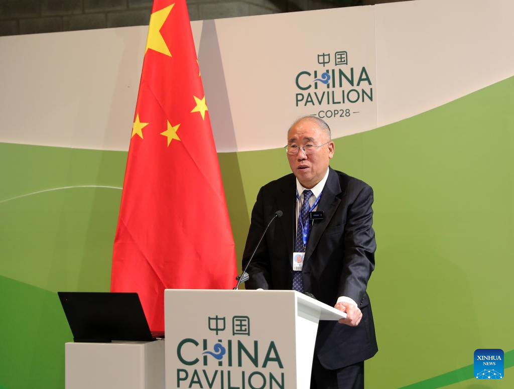 China's special envoy for climate change Xie Zhenhua speaks at a side event themed "Jointly Shaping a Resolute Future for Global Energy Transformation" of COP28 ongoing in Dubai, the United Arab Emirates, Dec. 9, 2023. (Xinhua/Wang Dongzhen)