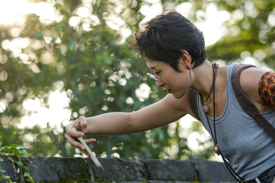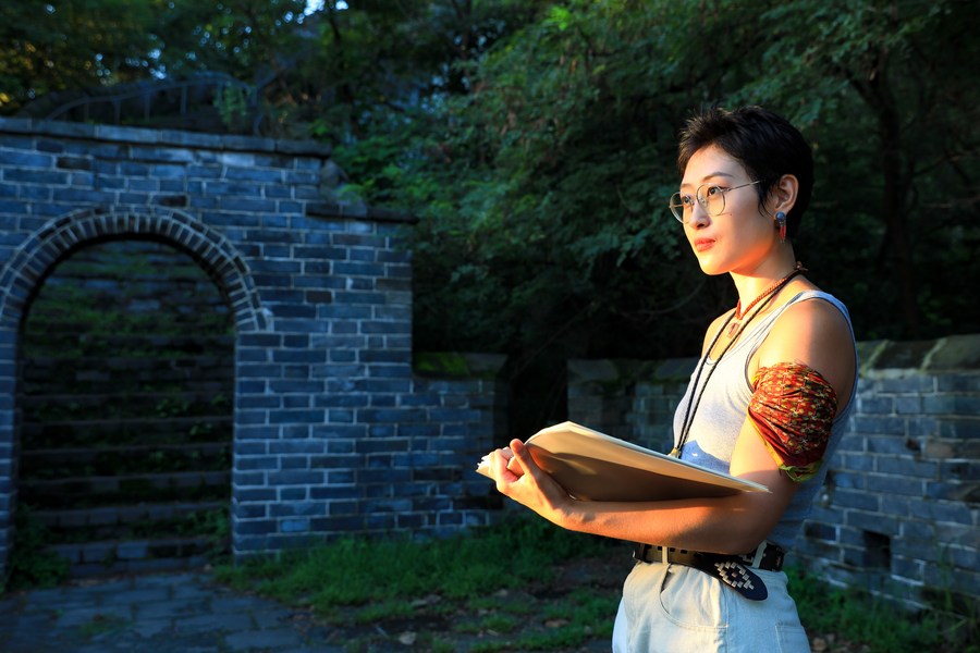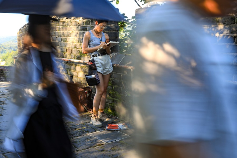 Jiang Yige creates a drawing at the Hushan section of the Great Wall in Dandong City, northeast China's Liaoning Province, Aug. 23, 2023. (Xinhua/Lu Zhe)