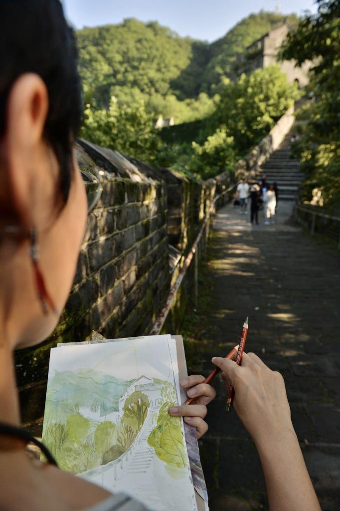 Jiang Yige creates a drawing at the Hushan section of the Great Wall in Dandong City, northeast China's Liaoning Province, Aug. 23, 2023. (Xinhua/Zhang Xinjing)