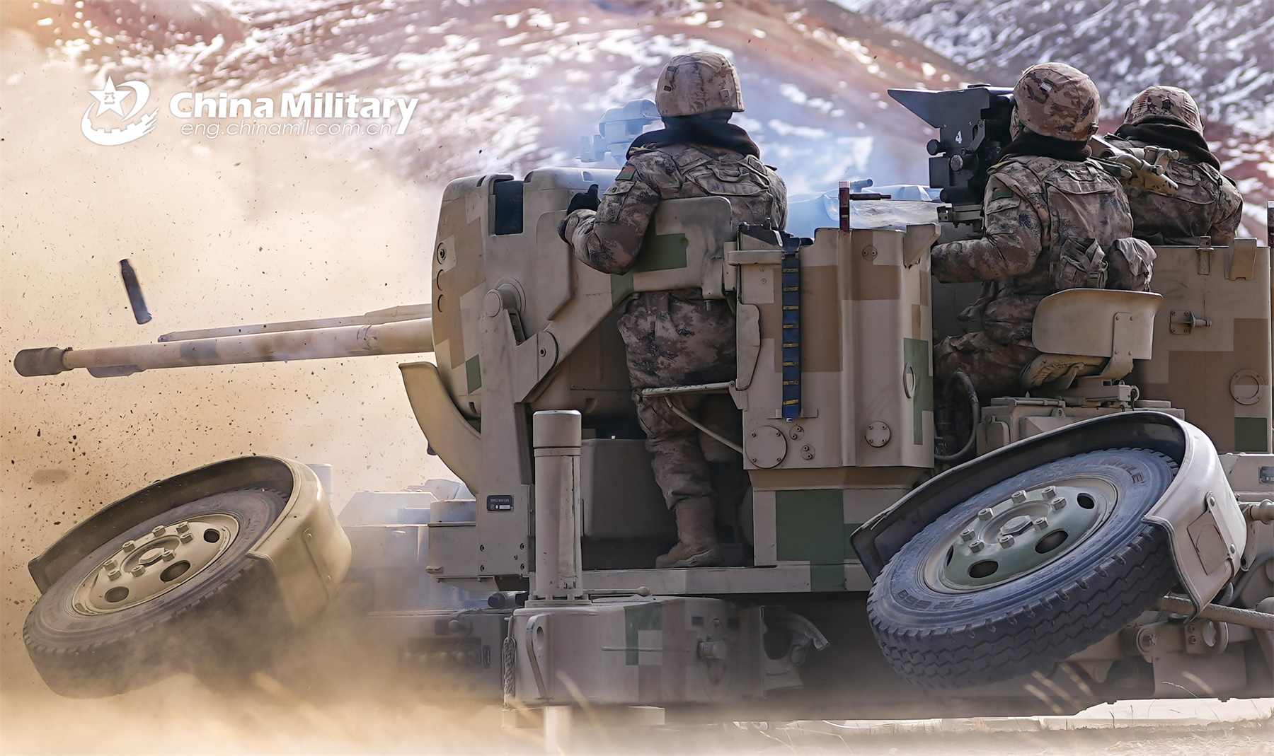 Artillerymen assigned to an air defense element of a combined-arms regiment under the PLA Xinjiang Military Command operate an anti-aircraft artillery system to attack mock targets during a live-fire test in late November, 2023. (eng.chinamil.com.cn/Photo by Zhou Kaiwei)