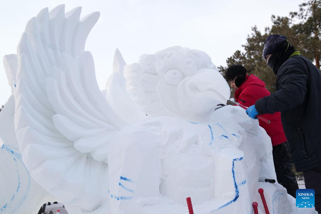 A sculptor works on a snow sculpture during a snow competition in Harbin, northeast China's Heilongjiang Province, Dec. 12, 2023. With numerous snow sculptures constructed in the theme park titled "snow world", the city of Harbin, known as China's "ice city" in the northeast, is witnessing the coming of its high season for tourism. (Xinhua/Wang Jianwei)