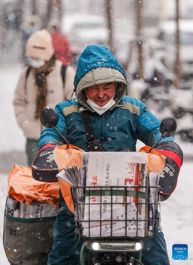 A man delivers newspapers in the snow on Yangfangdian Road in Beijing, capital of China, Dec. 13, 2023. (Xinhua/Chen Yehua)