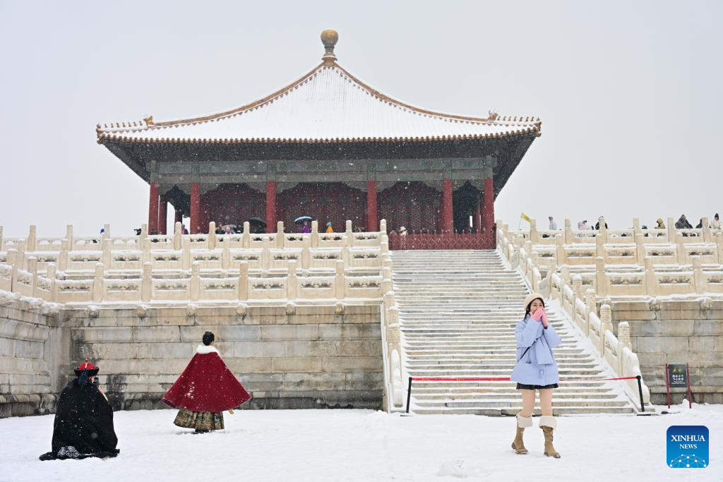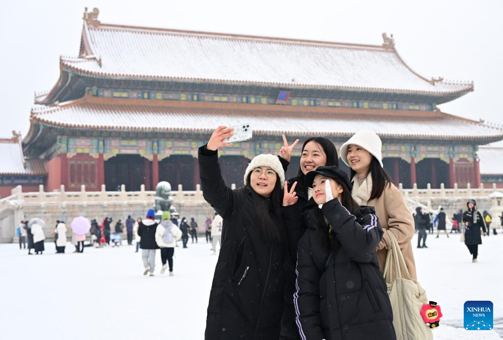 A tourist poses for a photo in snow at the Palace Museum in Beijing, capital of China, Dec. 13, 2023. China's meteorological authority on Wednesday renewed a yellow alert for blizzards, forecasting intense snowfall in the north of the country. (Xinhua/Chen Yehua)