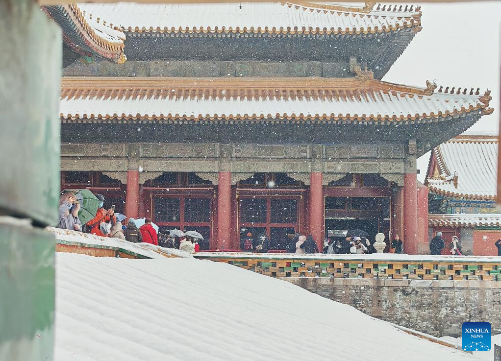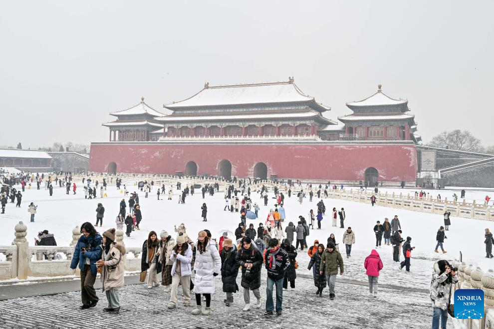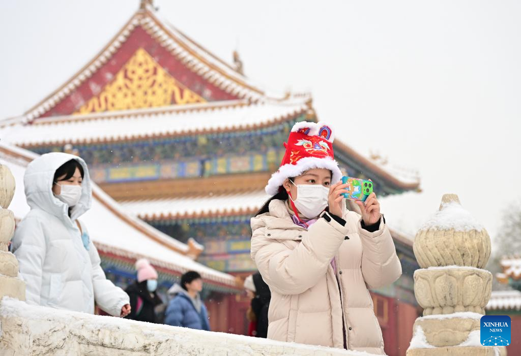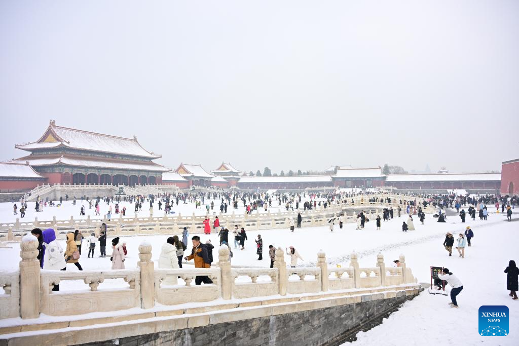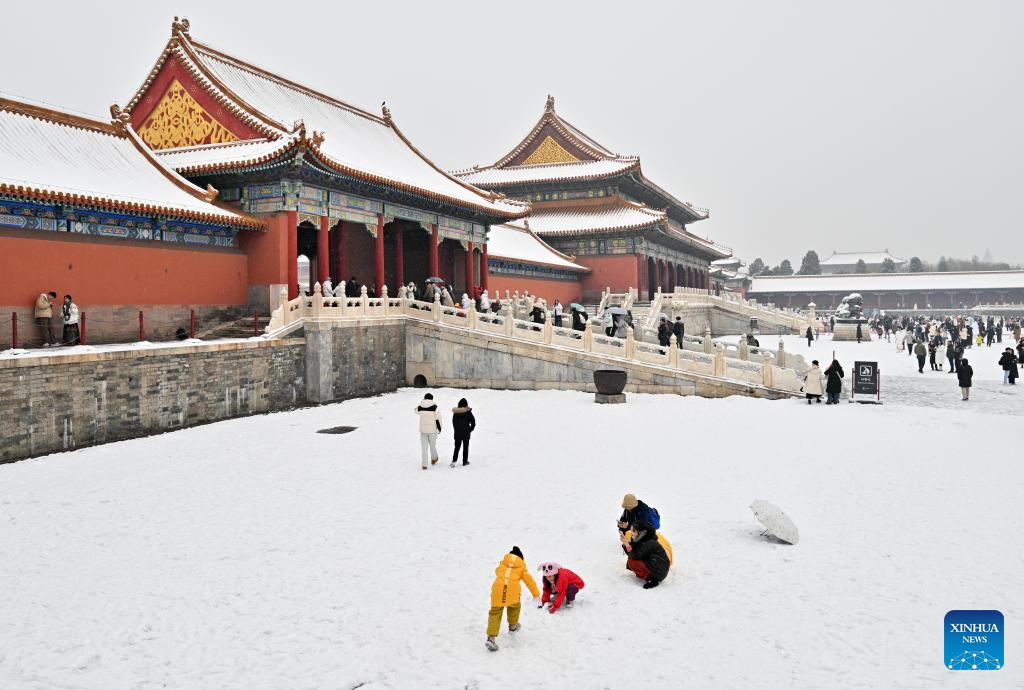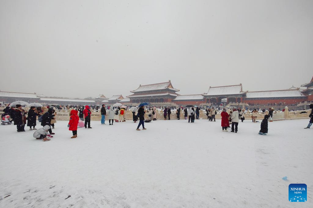 Tourists visit the Palace Museum in snow in Beijing, capital of China, Dec. 13, 2023. China's meteorological authority on Wednesday renewed a yellow alert for blizzards, forecasting intense snowfall in the north of the country. (Xinhua/Li Xin)
