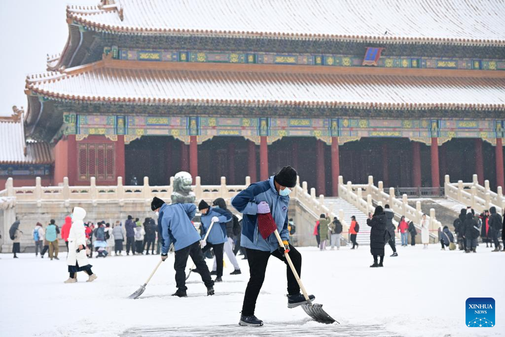 Staff members clear snow at the Palace Museum in Beijing, capital of China, Dec. 13, 2023. China's meteorological authority on Wednesday renewed a yellow alert for blizzards, forecasting intense snowfall in the north of the country. (Xinhua/Li Xin)