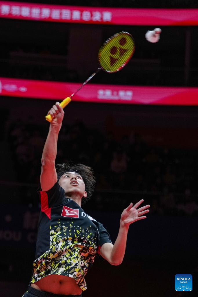 Naraoka Kodai competes during the men's singles group A match between Naraoka Kodai of Japan and Anthony Sinisuka Ginting of Indonesia at BWF World Tour Finals 2023 in Hangzhou, China, Dec. 13, 2023. (Xinhua/Sun Fei)