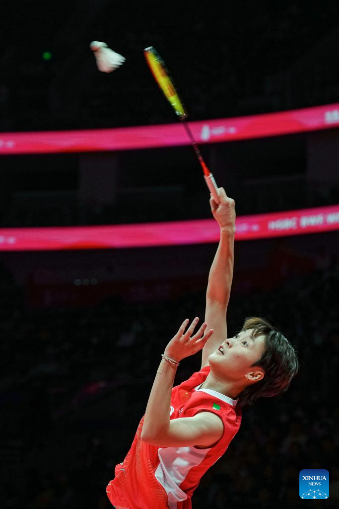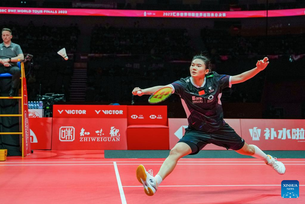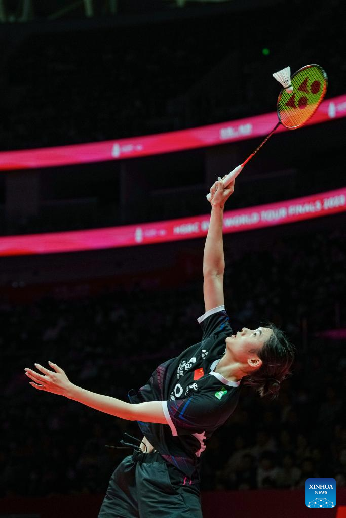 Han Yue competes during the women's singles group B match between Chen Yufei and Han Yue of China at BWF World Tour Finals 2023 in Hangzhou, China, Dec. 13, 2023. (Xinhua/Sun Fei)