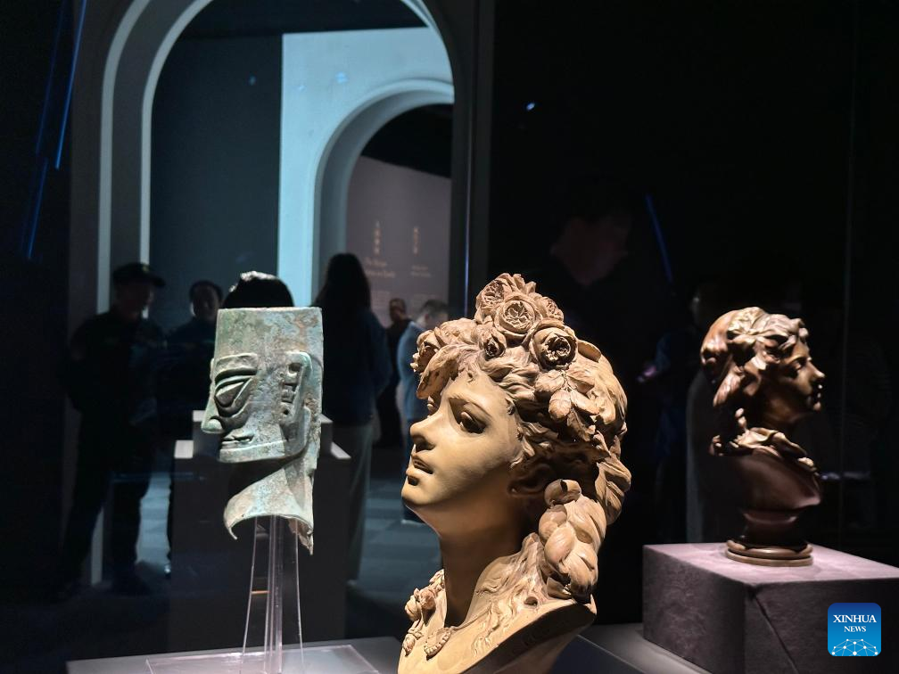 SHANGHAI, Dec. 14 (Xinhua) -- An exhibition featuring sculptures by the French sculptor Auguste Rodin and bronze relics from China's Sanxingdui Ruins opened in Shanghai on Wednesday, celebrating 60 years of diplomatic relations between China and France.