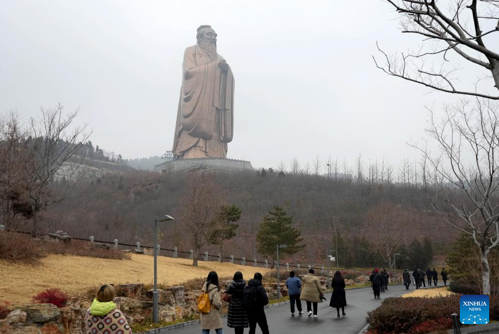 People walk past the statue of Confucius at the Nishan Sacredland scenic spot in Qufu City of east China's Shandong Province, Dec. 13, 2023. The Nishan Sacredland scenic spot, located in Qufu City, started its construction in 2012 and opened its core area to the public in 2018. The scenic spot, a destination for exploring the Confucianism, received nearly 2 million tourists this year. (Xinhua/Wang Yuguo)