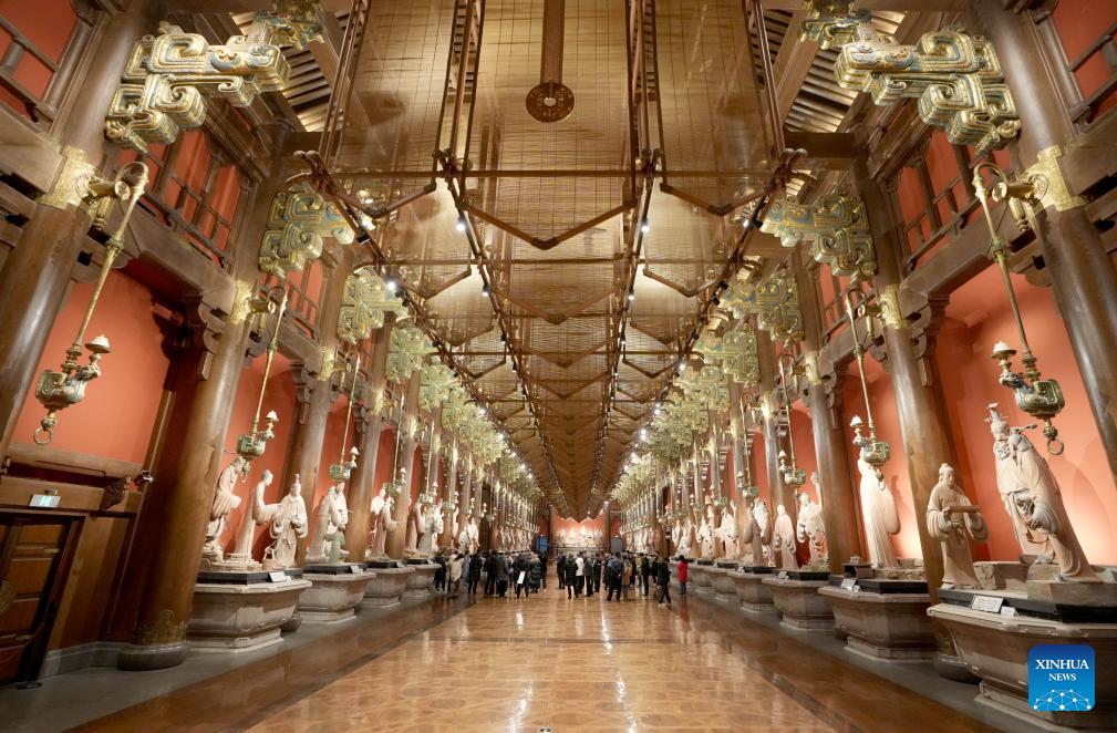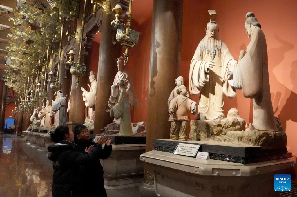 People watch sculptures at the Nishan Sacredland scenic spot in Qufu City of east China's Shandong Province, Dec. 13, 2023. The Nishan Sacredland scenic spot, located in Qufu City, started its construction in 2012 and opened its core area to the public in 2018. The scenic spot, a destination for exploring the Confucianism, received nearly 2 million tourists this year. (Xinhua/Wang Yuguo)
