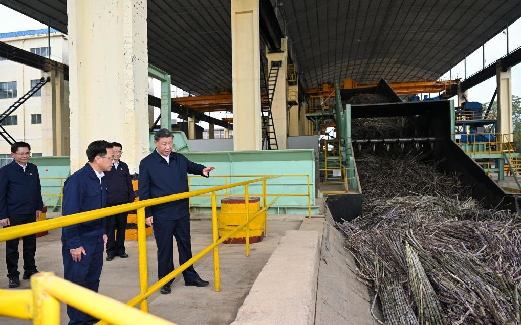 During the inspection, Xi visited a sugarcane base and a sugar company in the city, learning about the breeding, planting and harvesting of sugarcane and the development of the sugar industry.