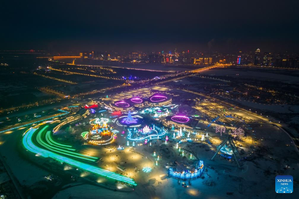 This aerial photo taken on Dec. 12, 2023 shows the construction site of the Harbin Ice and Snow World, a renowned seasonal theme park opening every winter, in Harbin, northeast China's Heilongjiang Province. Harbin Ice and snow World will open for its 25th winter season on Dec. 18. It is estimated that 250,000 cubic meters of ice and snow will be used in its construction. (Xinhua/Wang Jianwei)