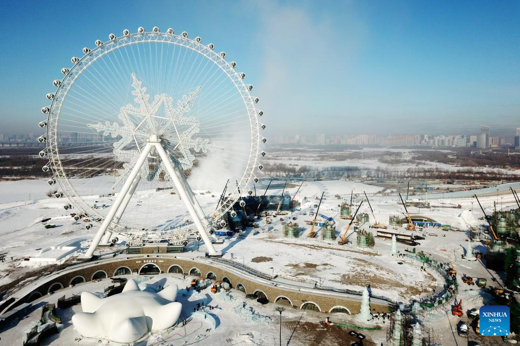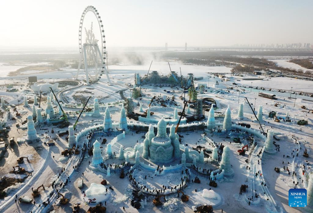 This aerial photo taken on Dec. 14, 2023 shows the construction site of the Harbin Ice and Snow World, a renowned seasonal theme park opening every winter, in Harbin, northeast China's Heilongjiang Province. Harbin Ice and snow World will open for its 25th winter season on Dec. 18. It is estimated that 250,000 cubic meters of ice and snow will be used in its construction. (Xinhua/Xie Jianfei)