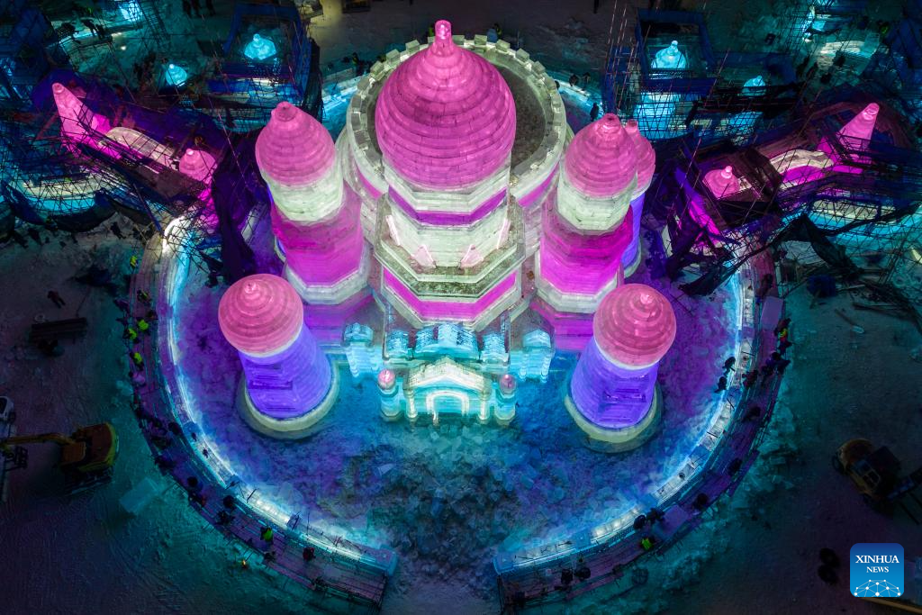Workers are seen at the construction site of the Harbin Ice and Snow World, a renowned seasonal theme park opening every winter, in Harbin, northeast China's Heilongjiang Province, Dec. 12, 2023. Harbin Ice and snow World will open for its 25th winter season on Dec. 18. It is estimated that 250,000 cubic meters of ice and snow will be used in its construction. (Xinhua/Zhang Tao)