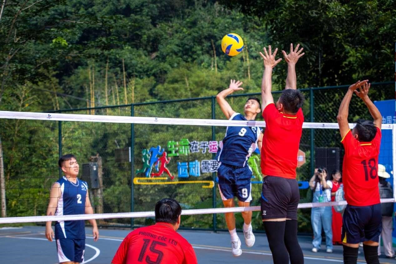 Volleyball amateurs from China and Vietnam compete in a game during a folk sports event hosted in Hekou Yao autonomous county, southwest China's Yunnan province, Nov. 2. (Photo/Zhao Jingzhi)