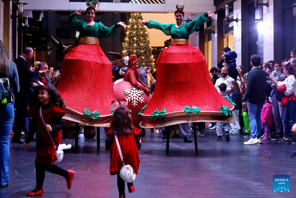 Dancers perform in front of Christmas decorations in Beirut, Lebanon, on Dec. 15, 2023. (Xinhua/Bilal Jawich)