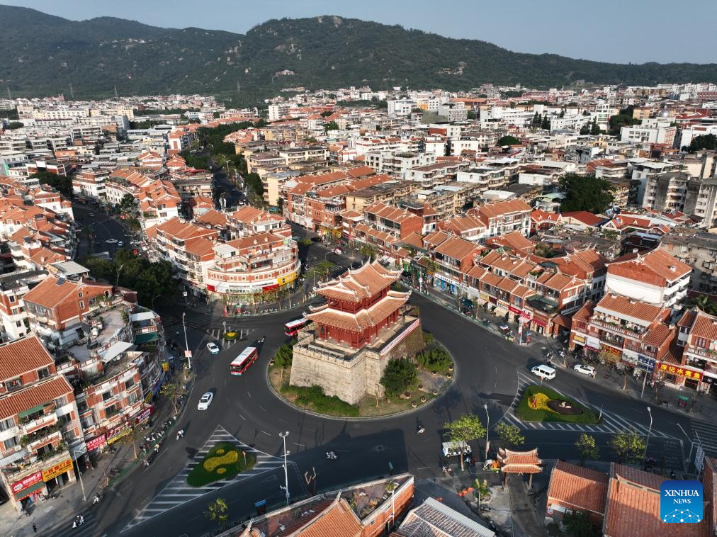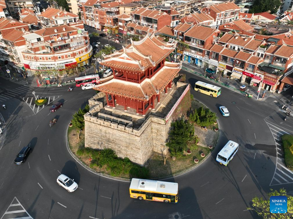 This aerial photo taken on Nov. 7, 2023 shows a wooden construction named Chaotianmen, one of the seven city gates of ancient Quanzhou, southeast China's Fujian Province. Located at the eastern end of the maritime Silk Road, Fujian has given play to its unique strengths in the joint implementation of the Belt and Road Initiative (BRI) and achieved fruitful results in building the core region of the 21st Century Maritime Silk Road.