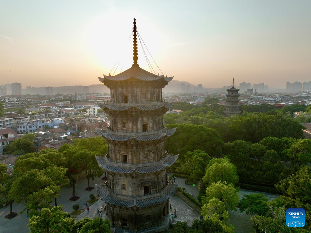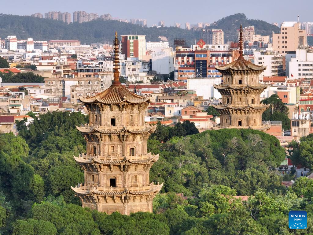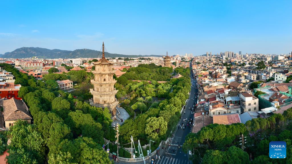 This aerial photo taken on Nov. 7, 2023 shows the east and west pagodas of Kaiyuan Temple and the surrounding core area for ancient city conservation in Quanzhou, southeast China's Fujian Province. Located at the eastern end of the maritime Silk Road, Fujian has given play to its unique strengths in the joint implementation of the Belt and Road Initiative (BRI) and achieved fruitful results in building the core region of the 21st Century Maritime Silk Road.