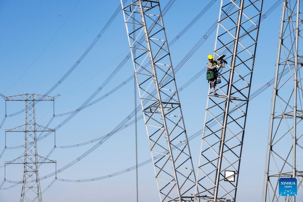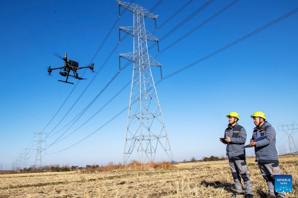 Technicians inspect the transmission lines with a drone in Hefei, east China's Anhui Province, Dec. 17, 2023. Countermeasures have been taken to prevent or alleviate impacts inflicted by extensive snowfall and other freezing conditions. (Xinhua/Du Yu)
