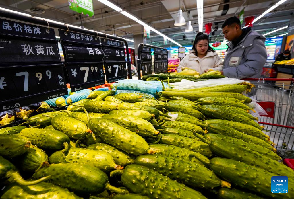 Customers visit a supermarket in Zunhua, north China's Hebei Province, Dec. 17, 2023. Countermeasures have been taken to prevent or alleviate impacts inflicted by extensive snowfall and other freezing conditions. (Photo by Liu Mancang/Xinhua)