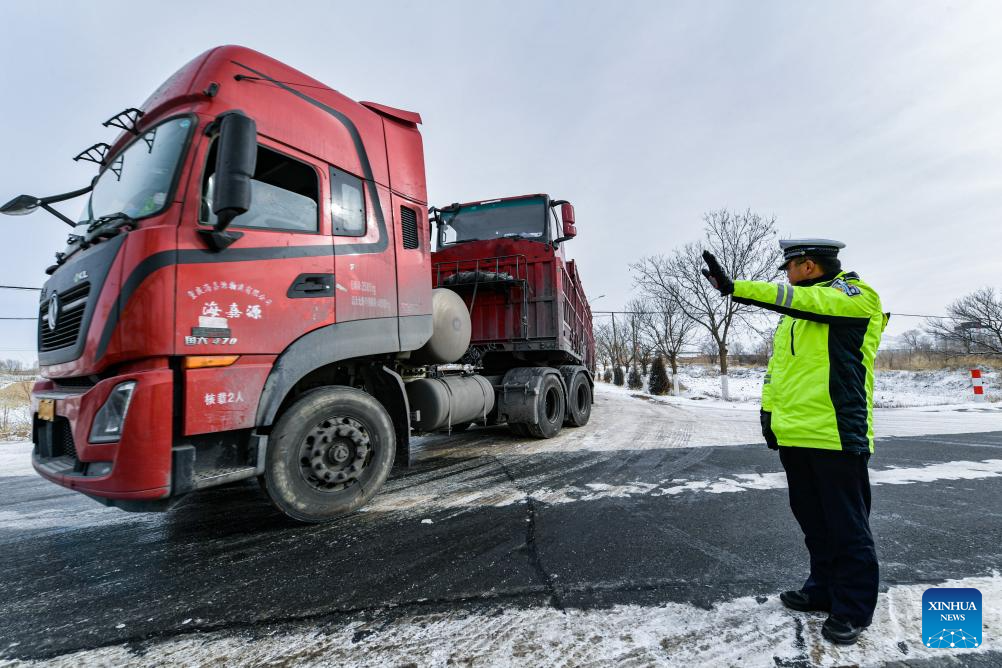 A police officer directs the traffic in Gulang, northwest China's Gansu Province, Dec. 17, 2023. Countermeasures have been taken to prevent or alleviate impacts inflicted by extensive snowfall and other freezing conditions. (Xinhua/Lang Bingbing)