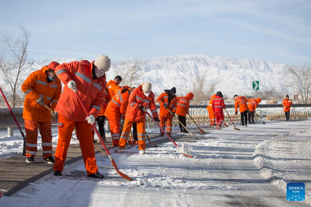 Staff members clear snow in the expressway in Wuwei City, northwest China's Gansu Province, Dec. 16, 2023. Countermeasures have been taken to prevent or alleviate impacts inflicted by extensive snowfall and other freezing conditions. (Photo by Jiang Aiping/Xinhua)