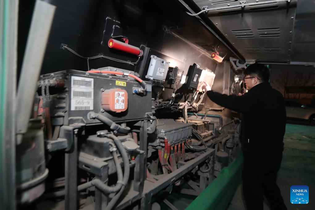A driver checks his bus at a parking lot in Shangqiu, central China's Henan Province, Dec. 17, 2023. Countermeasures have been taken to prevent or alleviate impacts inflicted by extensive snowfall and other freezing conditions. (Photo by Li Heng/Xinhua)