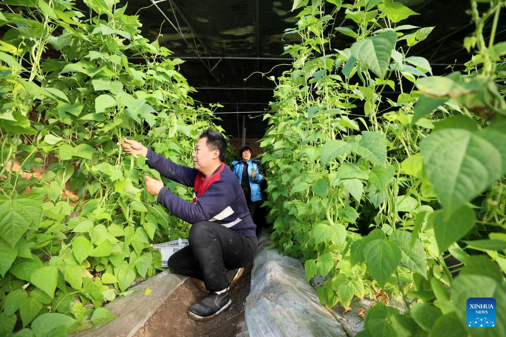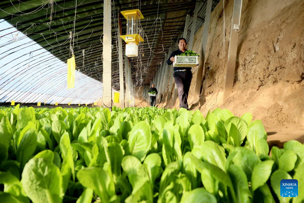 Farmers pick vegetables at a greenhouse in Longyao County, north China's Hebei Province, Dec. 17, 2023. Countermeasures have been taken to prevent or alleviate impacts inflicted by extensive snowfall and other freezing conditions. (Xinhua/Mu Yu)