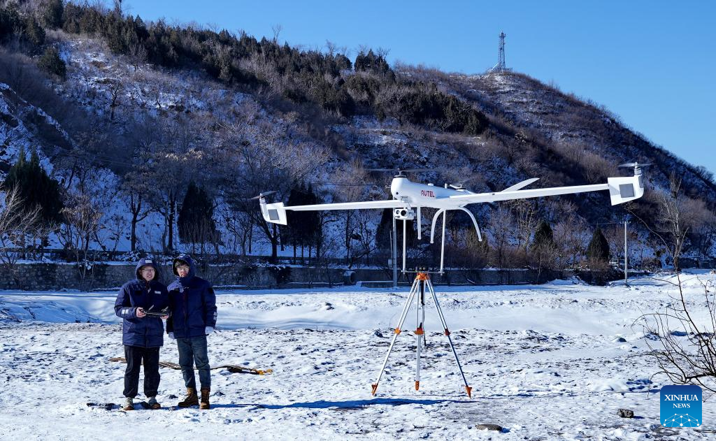 Staff workers of power supply company operate a drone to patrol power lines in Beijing, capital of China, Dec. 17, 2023. Countermeasures have been taken to prevent or alleviate impacts inflicted by extensive snowfall and other freezing conditions. (Xinhua/Li Xin)