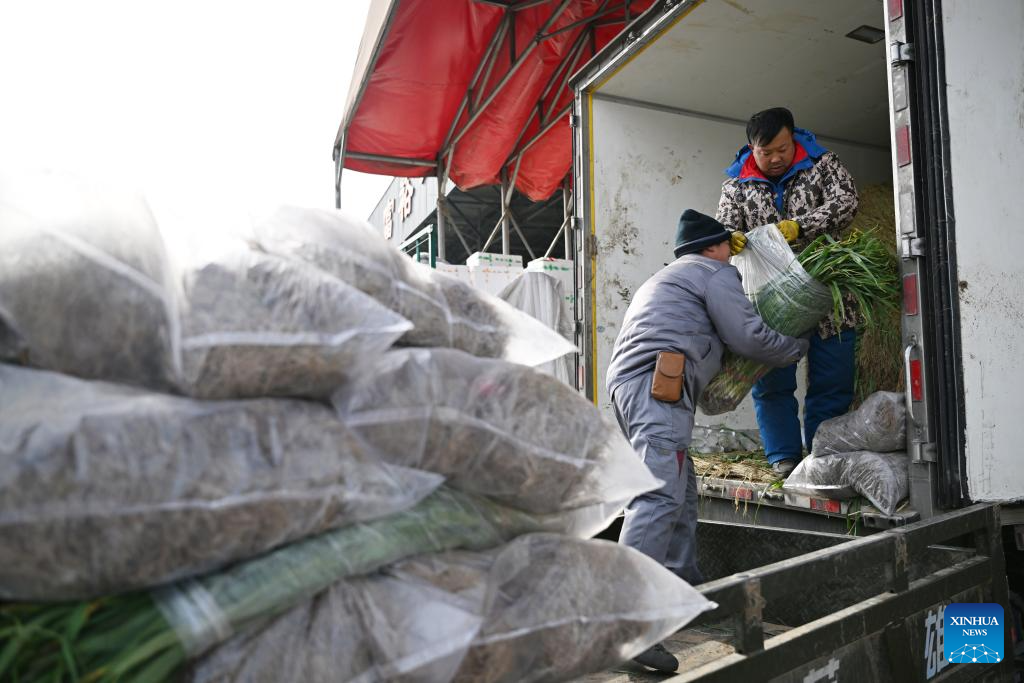 Farmers package blanched garlic leaves in Liuxicun Township in Zunhua, north China's Hebei Province, Dec. 17, 2023. Countermeasures have been taken to prevent or alleviate impacts inflicted by extensive snowfall and other freezing conditions. (Photo by Liu Mancang/Xinhua)