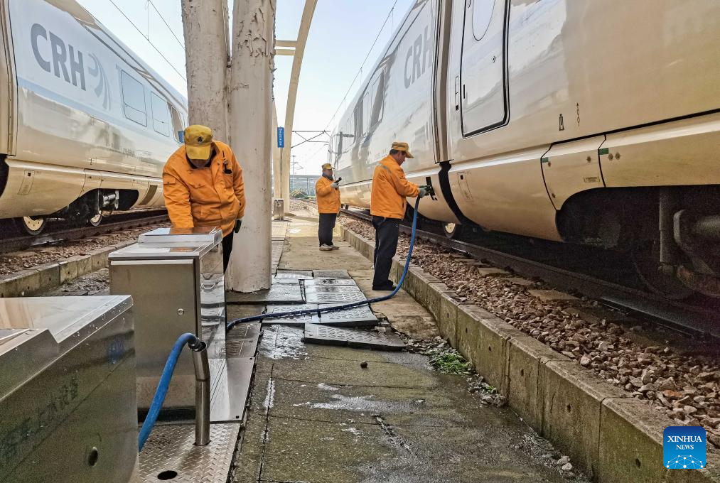 Staff workers pump water into a train at Shanghai Hongqiao Railway Station in east China's Shanghai, Dec. 17, 2023. Countermeasures have been taken to prevent or alleviate impacts inflicted by extensive snowfall and other freezing conditions. (Xinhua)